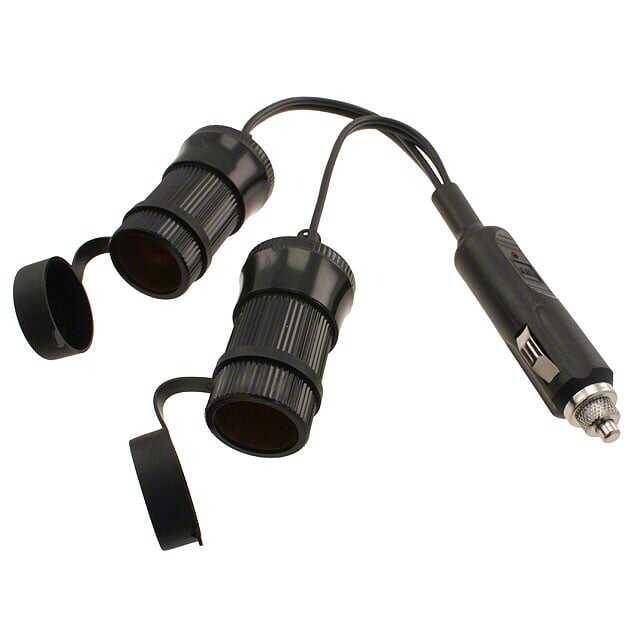 Cable, Auto Power Plug to Dual Auto Power Sockets Cigarette Lighter Assembly 12 V 10 A 8" (203mm) Cord, ABS, Fused, LED Indicator Black