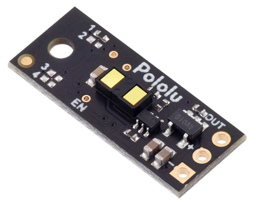 This small lidar-based distance sensor detects the presence of objects within 50 cm (20″). It has a single digital output that drives low when an object is being detected; otherwise, it is high. It works over an input voltage range of 3.0 V to 5.5 V, and the 0.1″ pin spacing makes it easy to use with standard solderless breadboards and 0.1″ perfboards.